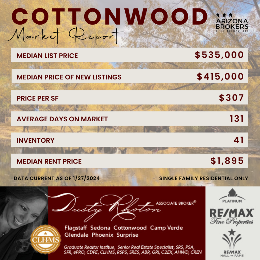 Existing-home sales fell 0.7% in 2024 from the prior year to 4.06 million. That is down from more than 6 million in 2021….and 7.08 million in 2005. The national median existing-home price in December was $404,400, down from the record high of $426,900 reached in June. Nationally, there were 1.15 million homes for sale or under contract at the end of December, down 13.5% from November but…..up 16.2% from December 2023. (NAR) Click on the market areas I have attached to get an UP CLOSE look at Today’s statistics for Flagstaff, Sedona, Camp Verde and more!
